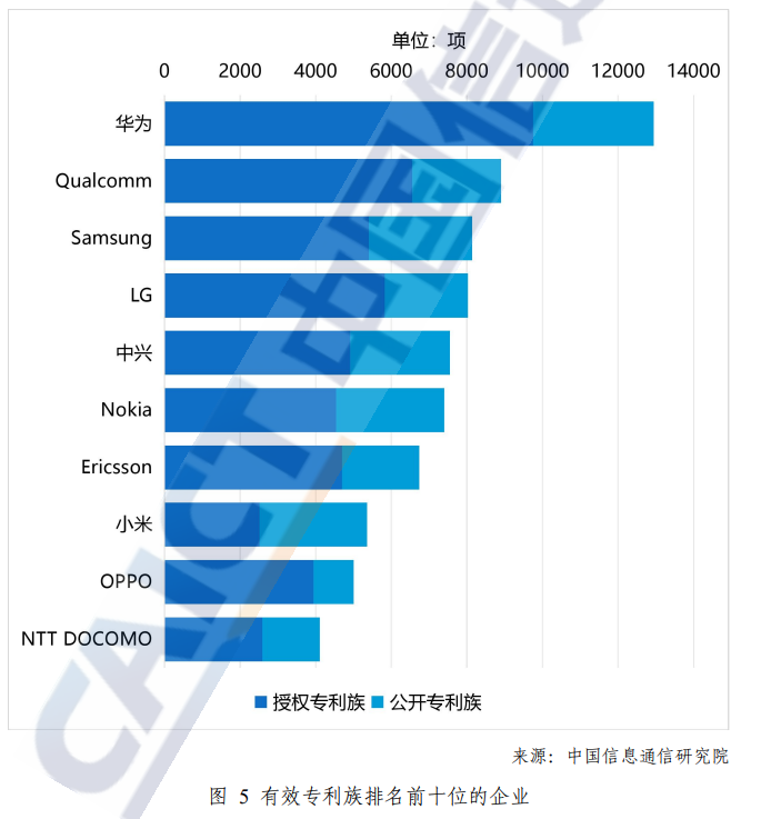 按比例计算,华为的有效专利族数量占比为11.70%,排名第一位;高通排在第二位,其占比为8.05%;三星排在第三位,其占比为7.36%。排名第四位至第十位的企业依次是 LG(7.25%)、中兴 (6.82%)、诺基亚 (6.69%)、爱立信 (6.09%)、小米(4.84%)、OPPO (4.52%)和NTT DOCOMO (3.72%)。