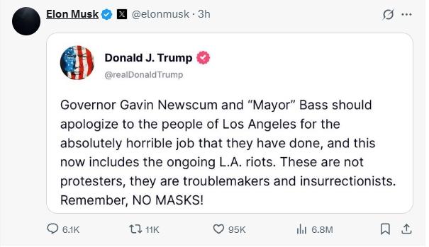 马斯克还转发了特朗普要求加州州长纽森及洛杉矶市长巴斯应向洛杉矶市民道歉的贴文。特朗普表示,“州长加文·纽森和“市长”巴斯应该向洛杉矶人民道歉,为他们糟糕的工作,这其中还包括正在进行的洛杉矶骚乱而道歉。这些人不是抗议者,他们是麻烦制造者和叛乱分子。记住,不要戴口罩!”