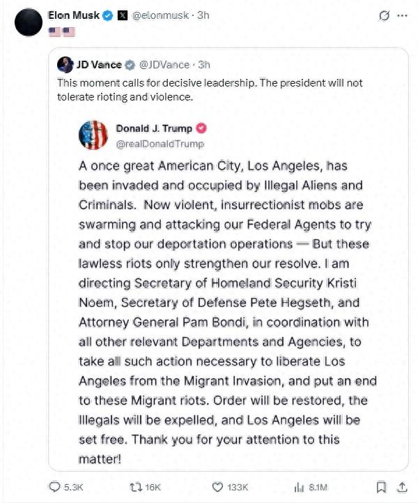 美国副总统万斯转发了这条消息并盛赞特朗普“果断的领导力”,“总统不会容忍骚乱和暴力”。马斯克紧随其后,转发了万斯的贴文并附上了两张美国国旗标志的贴图。